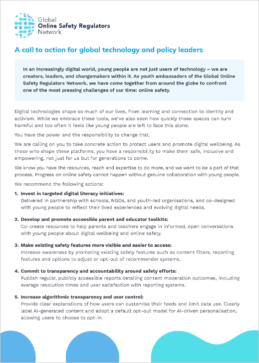 Through exchanges with representatives from 5Rights, the Family Online Safety Institute and the Integrity Institute, the group identified practical actions that global technology companies and policy makers can take to support young people to have safer, more informed online experiences.