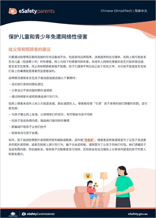 这个人可能是朋友 亲戚或陌生人 作为父母和照护者 如需学习如何使用网络安全功能 以及如何在孩子的 与其谈论网络性侵害问题 请访问 eSafety.gov.au |