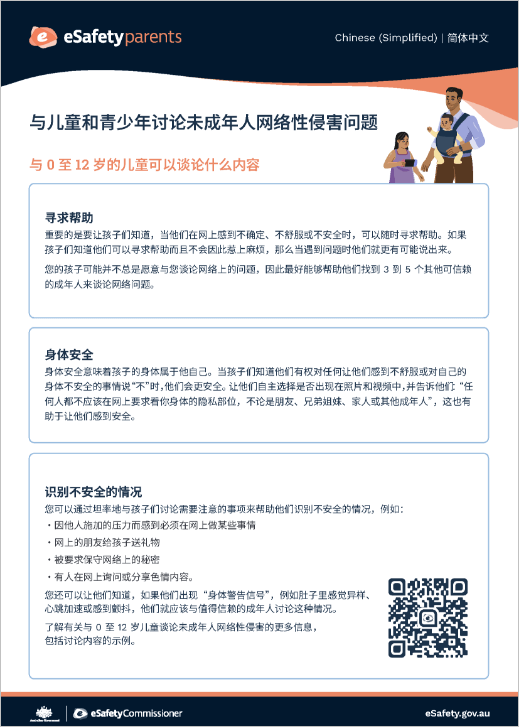 如需了解有关如何 与其谈论网络性侵害的更多方法 请访问 eSafety.gov.au |