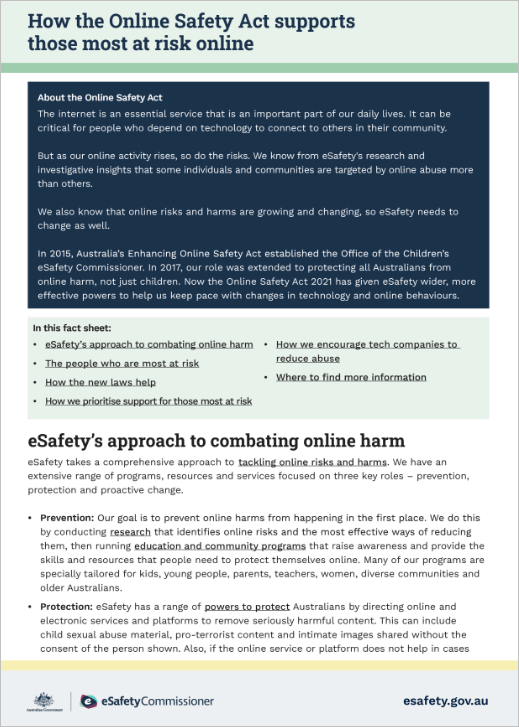 eSafety’s public statement Protecting Voices at Risk Online outlines how some individuals and groups are at greater risk of being the target of online harms.