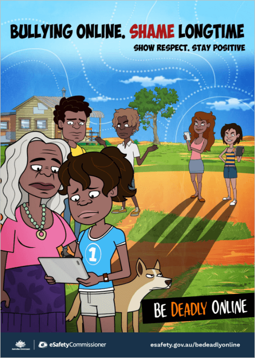 [Reads title] Bullying online, shame long time. Cyberbullying is bullying using phones and online sites. It can happen to anyone and can leave you feeling unsafe and feeling shame. Cyberbullying can make you feel alone, outside your friends, family and the mob. It can split families and communities, and sometime can lead to payback and violence. |