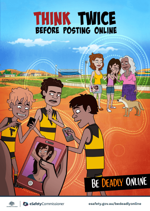 Young person: So how do I do that, Unc? Elder: Think about how you speak to others when you go online. It's easy to get the wrong idea about online messages because it's not face-to-face. Sometimes this causes hurt and brings shame to the mob. Communicate and share stories in a positive way. Think twice before posting pics. Ask yourself, would you want your family to see it? Remember, what you post can be easily shared without your commission. |
