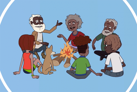 Elder: The last thing you need to remember is to respect your environment. Young person: What are you talking about, Unc? How do you respect a tree? Elder: Nah. It's about the environment you live in, your family, the community and our mob everywhere. |