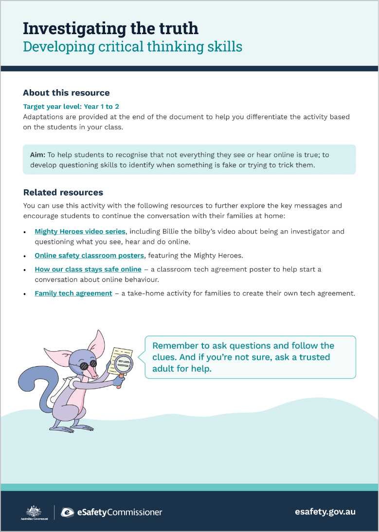 This resource aligns with Billie the bilby’s online safety message about the importance of critical thinking and questioning what you see, hear and do online.