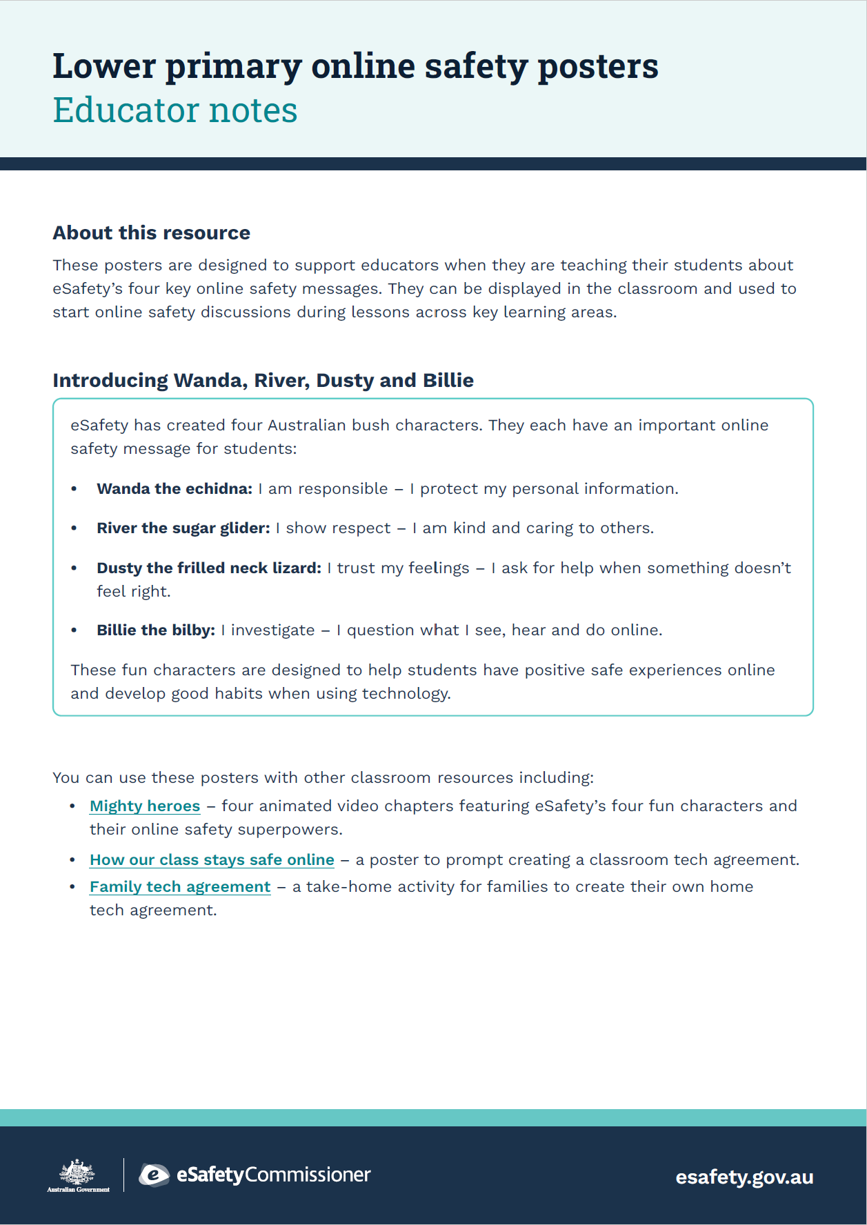 eSafety has created four Australian bush characters – the Mighty Heroes. They each have their own poster with an important online safety message for students: