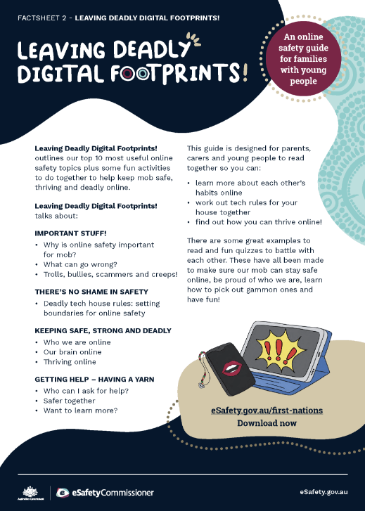 Us mob are some of the deadliest storytellers in the world. Being online gives us more ways to share our stories and culture and engage with our mob, but sometimes we spend a bit too much time on there or come across gammon people. The Leaving Deadly Digital Footprints guide helps everyone and our family learn more about online safety. Check it out! |