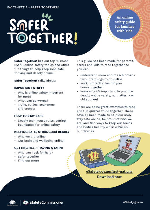 My granddad told me that our mob are some of the deadliest storytellers in the world and the oldest. Now the internet lets us share our stories and culture with biggest mobs of people. But sometimes we spend a bit too much time on there or come across gammon people. The Safer Together Guide helps me and my family be safe and deadly online. Check it out.