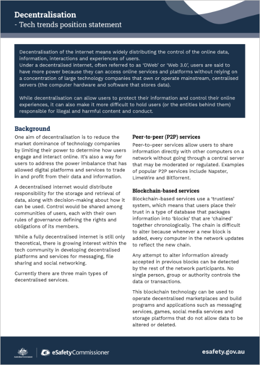 eSafety recognises that decentralised systems may help to protect certain elements of privacy and security. Our focus is on working with industry and developers to ensure that decentralised services and platforms are aware of Safety by Design principles and adopt them, so the online safety risks of decentralisation are considered along with the benefits.