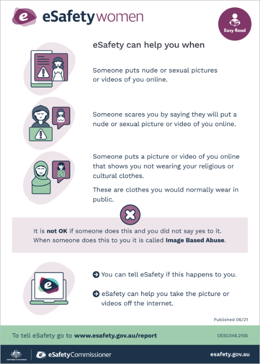 This Easy Read poster and booklet help people find out what to do if someone shares or threatens to share intimate images or videos of someone without their consent.
