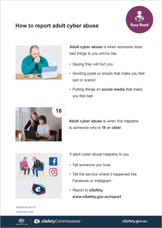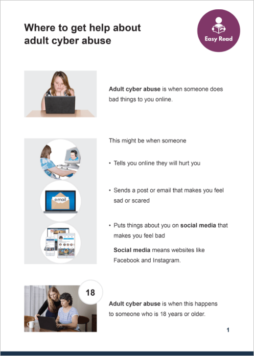 This Easy Read poster and booklet explain what to do if someone experiences adult cyber abuse and how to report it. Click on the links to download and print copies.