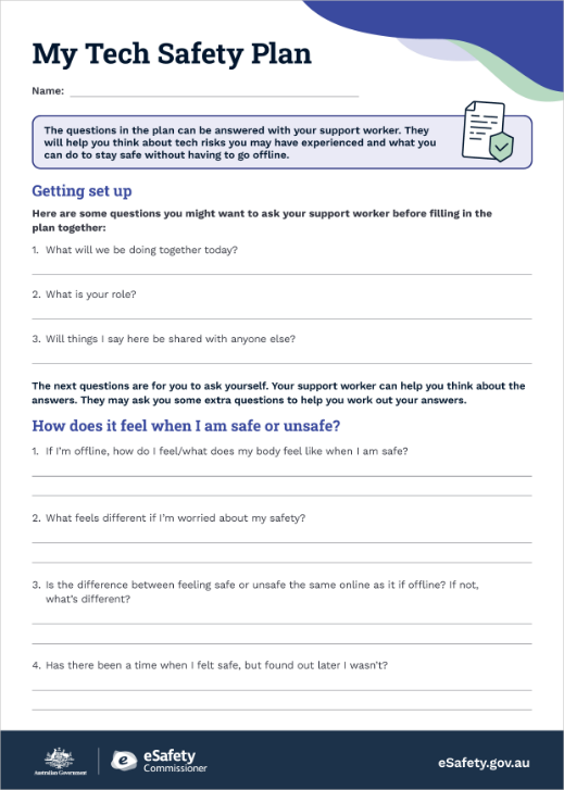 • Ensure you have the informed consent of the child or young person before helping them to fill out ‘My Tech Safety Plan’. This means that the child or young person understands what it is for and how you will use it together. Depending on the age and maturity of the child or young person, you may consider talking about what information you might collect and how it will be stored. You may also need to mention your organisation’s privacy policy.