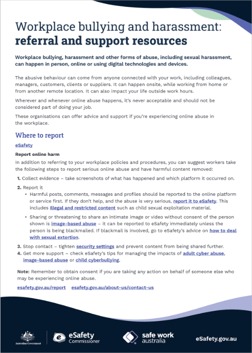 Workplace bullying and harassment, including sexual harassment, reporting, referral and support services. These organisations offer advice and support if you’re experiencing online abuse in the workplace.