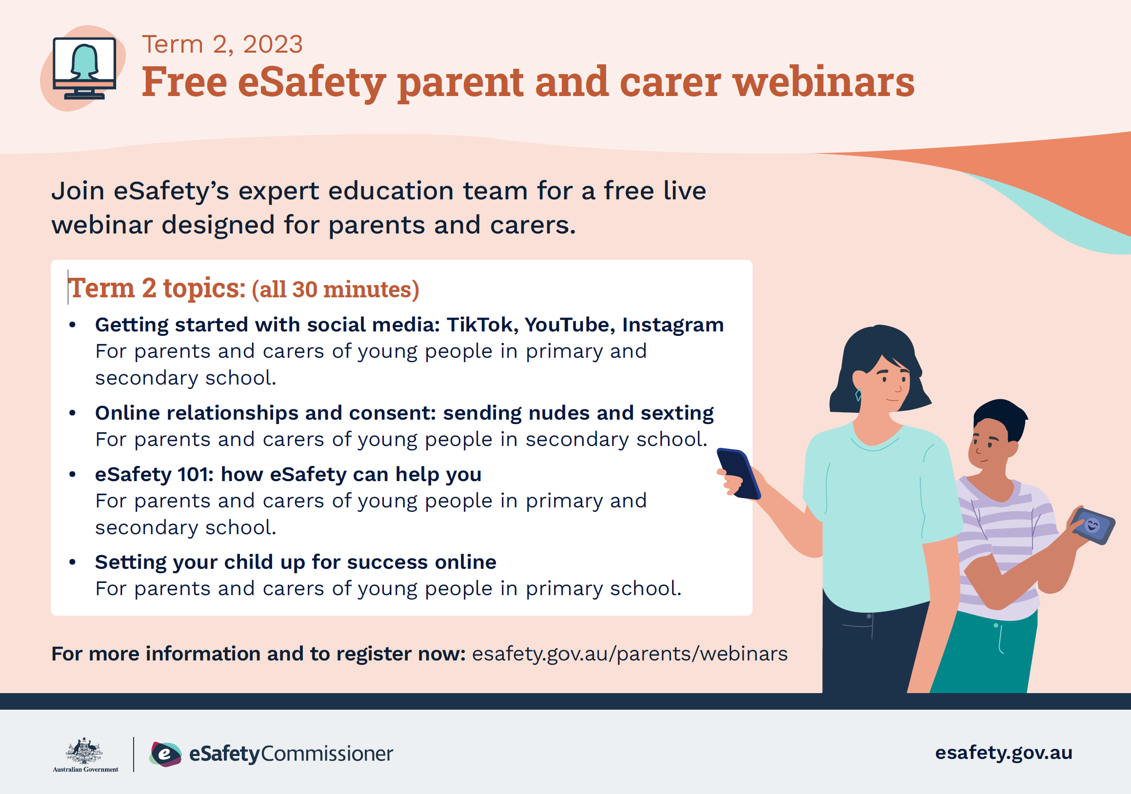 Parental controls can be a useful addition to the strategies you use to help protect your child online. This 45-minute webinar covers the types of controls available, and how to use them alongside other online safety measures. It’s suitable for parents and carers of primary and high school students. Learn more about this webinar.