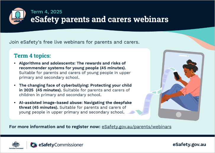 AI chatbots and companions that act like friends or partners are becoming more common – but they can be risky to children and young people. The 45-minute webinar explores what AI companions are, the risks to look out for and how to talk to your child about them. It’s suitable for parents and carers of upper primary and high school students. Learn more about this webinar.